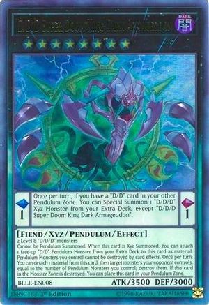 2 Level 8 "D/D/D" monsters Cannot be Pendulum Summoned. When this card is Xyz Summoned: You can attach 1 face-up "D/D" Pendulum Monster from your Extra Deck to this card as material. Pendulum Monsters you control cannot be destroyed by card effects. Once per turn: You can detach 1 material from this card, then target monsters your opponent controls, equal to the number of Pendulum Monsters you control; destroy them. If this card in the Monster Zone is destroyed: You can place this card in your Pendulum Zone.