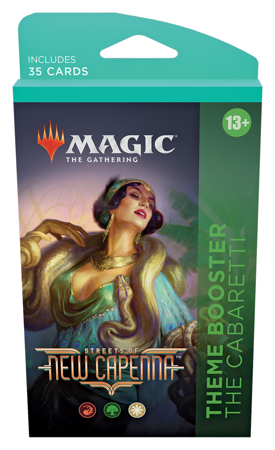 The Cabaretti Streets of New Capenna Theme Booster (Red-Green-White) contains 35 cards, with a combination of 1–2 cards of rarity Rare or higher (2 in 10% of packs) and 33–34 Uncommon and/or Common cards.