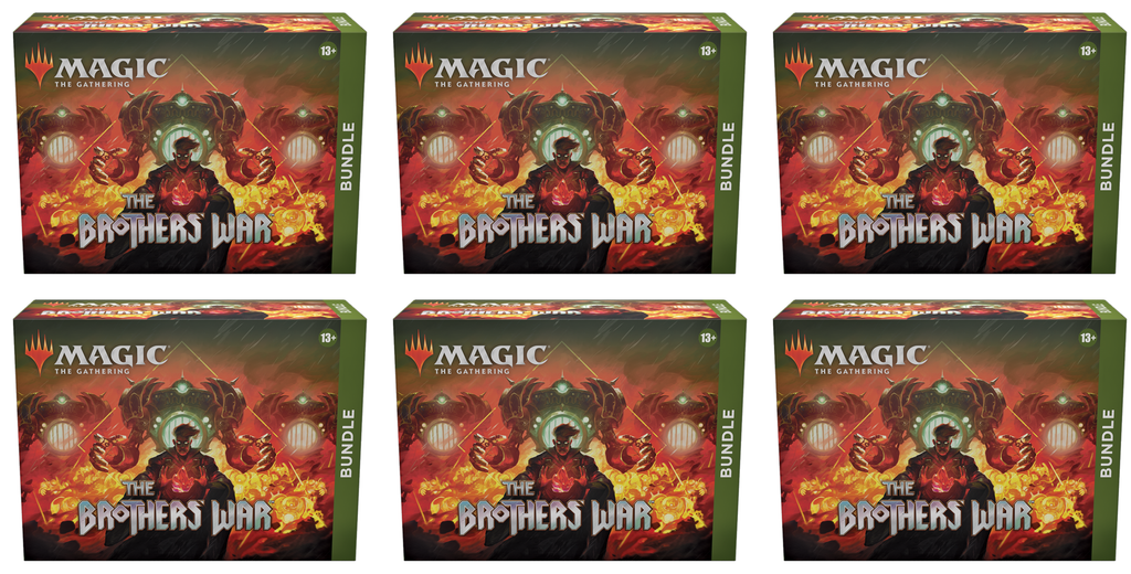 The Brothers' War Bundle contains 8 The Brothers' War Set Boosters—the best boosters to open just for fun—plus exclusive accessories, with 40 basic lands (20 traditional foils and 20 nonfoils), 1 Traditional Foil promo card with Bundle-exclusive alternate art, 1 oversized Spindown life counter (red or green), 1 card storage box, and 2 reference cards.