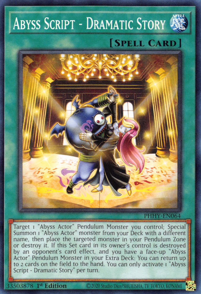 Target 1 "Abyss Actor" Pendulum Monster you control; Special Summon 1 "Abyss Actor" monster from your Deck with a different name, then place the targeted monster in your Pendulum Zone or destroy it. If this Set card in its owner's control is destroyed by an opponent's card effect, and you have a face-up "Abyss Actor" Pendulum Monster in your Extra Deck: You can return up to 2 cards on the field to the hand. You can only activate 1 "Abyss Script - Dramatic Story" per turn.
