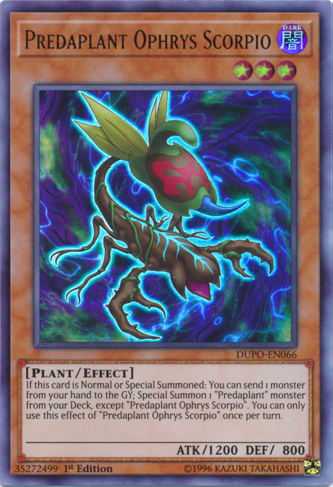 If this card is Normal or Special Summoned: You can send 1 monster from your hand to the GY; Special Summon 1 "Predaplant" monster from your Deck, except "Predaplant Ophrys Scorpio". You can only use this effect of "Predaplant Ophrys Scorpio" once per turn.