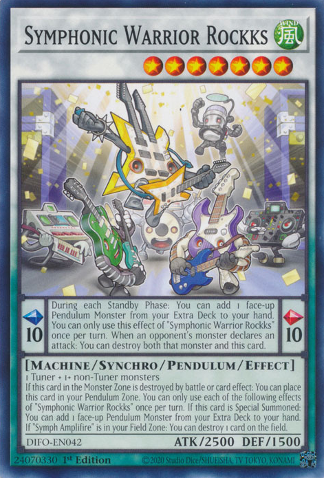 1 Tuner + 1+ non-Tuner monsters If this card in the Monster Zone is destroyed by battle or card effect: You can place this card in your Pendulum Zone. You can only use each of the following effects of "Symphonic Warrior Rockks" once per turn. If this card is Special Summoned: You can add 1 face-up Pendulum Monster from your Extra Deck to your hand. If "Symph Amplifire" is in your Field Zone: You can destroy 1 card on the field.