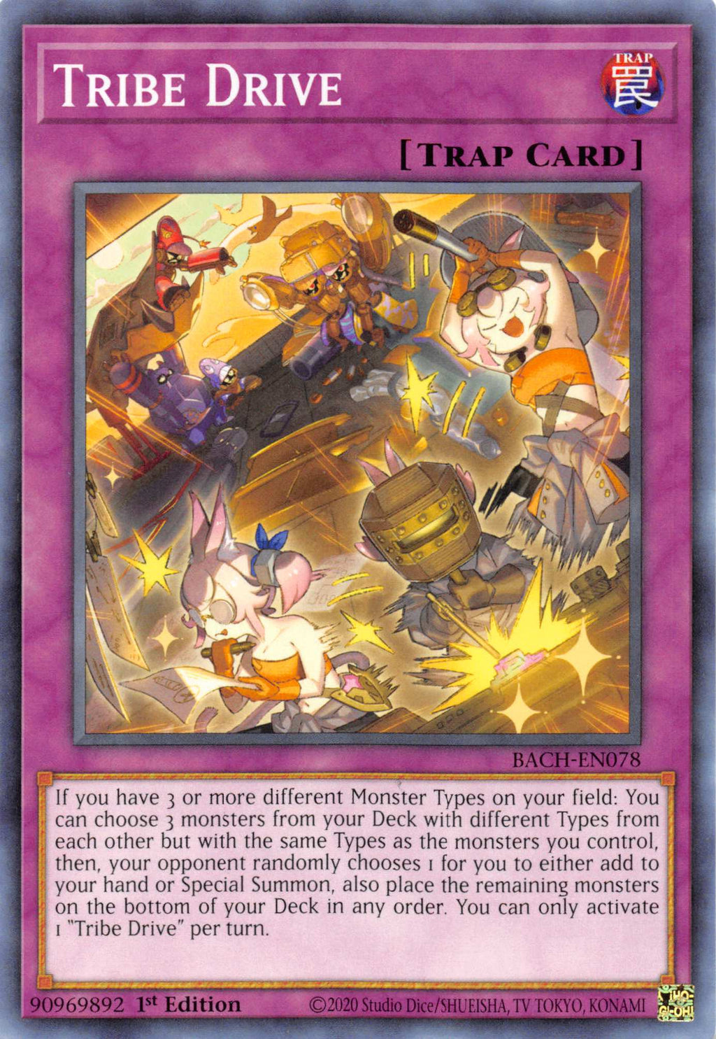 If you have 3 or more different Monster Types on your field: You can choose 3 monsters from your Deck with different Types from each other but with the same Types as the monsters you control, then, your opponent randomly chooses 1 for you to either add to your hand or Special Summon, also place the remaining monsters on the bottom of your Deck in any order. You can only activate 1 "Tribe Drive" per turn.