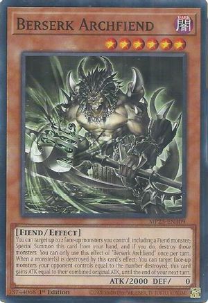 You can target up to 2 face-up monsters you control, including a Fiend monster; Special Summon this card from your hand, and if you do, destroy those monsters. You can only use this effect of "Berserk Archfiend" once per turn. When a monster(s) is destroyed by this card's effect: You can target face-up monsters your opponent controls equal to the number destroyed; this card gains ATK equal to their combined original ATK, until the end of your next turn.