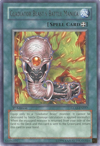 Equip only to a "Gladiator Beast" monster. It gains 300 ATK. When the equipped monster is returned from your side of the field to the Deck and this card is sent to the Graveyard, return this card to your hand.