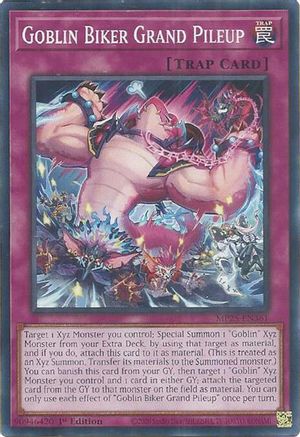 Target 1 Xyz Monster you control; Special Summon 1 "Goblin" Xyz Monster from your Extra Deck, by using that target as material, and if you do, attach this card to it as material. (This is treated as an Xyz Summon. Transfer its materials to the Summoned monster.) You can banish this card from your GY, then target 1 "Goblin" Xyz Monster you control and 1 card in either GY; attach the targeted card from the GY to that monster on the field as material. You can only use each effect of "Goblin Biker Grand Pileup" once per turn.
