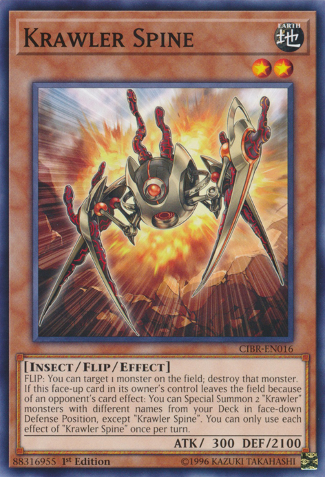 FLIP: You can target 1 monster on the field; destroy that monster. If this face-up card in its owner's control leaves the field because of an opponent's card effect: You can Special Summon 2 "Krawler" monsters with different names from your Deck in face-down Defense Position, except "Krawler Spine". You can only use each effect of "Krawler Spine" once per turn.