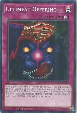 During your Main Phase: You can pay 1000 LP; you can conduct up to 3 Normal Summons/Sets this turn, not just 1. During your opponent's Battle Phase: You can pay 500 LP; immediately after this effect resolves, Normal Summon 1 monster. You can only use each effect of "Ultimeat Offering" once per turn.