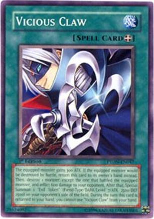 The equipped monster gains 300 ATK. If the equipped monster would be destroyed by battle, return this card to its owner's hand instead. Then, destroy 1 monster, except the one that battled the equipped monster, and inflict 600 damage to your opponent. After that, Special Summon 1 "Evil Token" (Fiend-Type/DARK/Level 7/ATK 2500/DEF 2500) on your opponent's side of the field. During the turn this card is returned to your hand, you cannot use "Vicious Claw" from your hand.