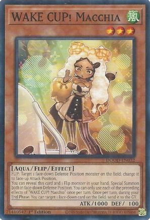FLIP: Target 1 face-down Defense Position monster on the field; change it to face-up Attack Position. You can reveal this card and 1 Flip monster in your hand; Special Summon both in face-down Defense Position. You can only use each of the preceding effects of "WAKE CUP! Macchia" once per turn. Once per turn, during your End Phase: You can target 1 face-down card on the field; send it to the GY.