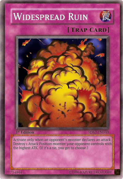 Activate only when your opponent declares an attack. Destroy 1 Attack Position monster your opponent controls with the highest ATK. (If it's a tie, you get to choose.)