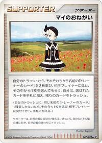 Search your discard pile for 2 different Trainer, Supporter, or Stadium cards, show them to your opponent, and your opponent chooses 1 of them. Put that card into your hand, and discard the other card. (If all Trainer, Supporter, and Stadium cards in your discard pile have the same name, choose 1 of them. Show that card to your opponent and put it into your hand.)